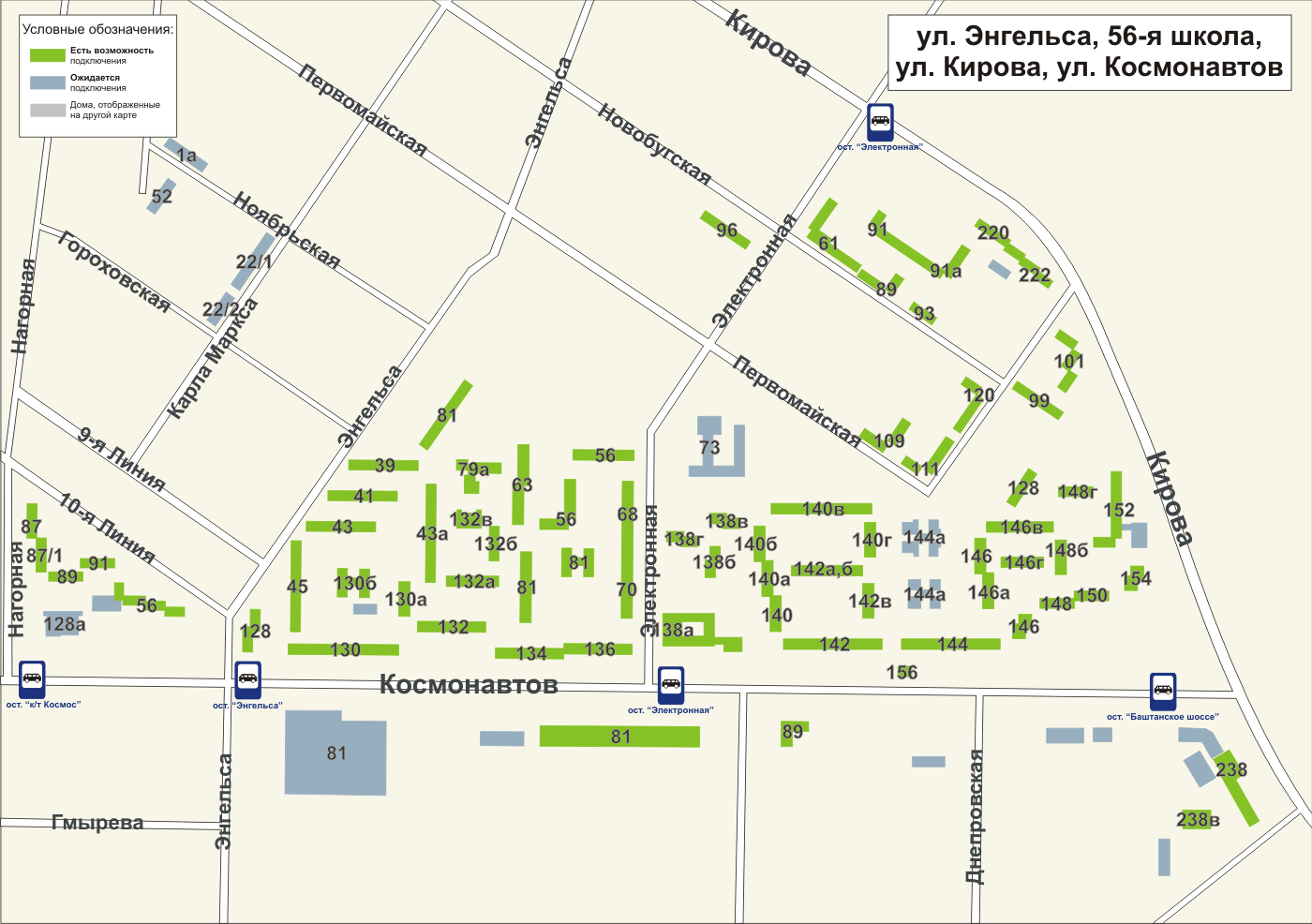 ул. Энгельса, 56-я школа, ул. Кирова, ул. Космонавтов